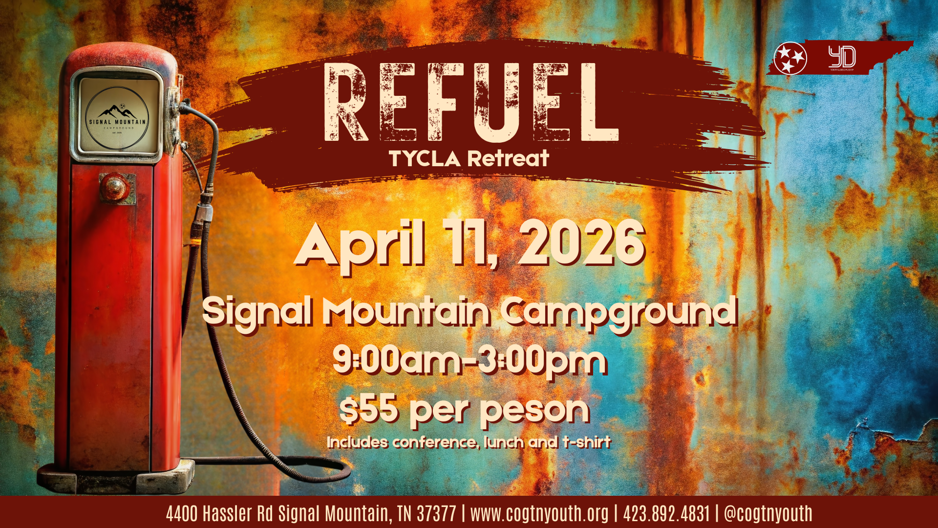 Join us at the TYCLA Retreat on April 11th at the Signal Mountain Campground. This one-day training event is an opportunity for enhancing your areas of ministry as we collaborate together to transform the next generation.