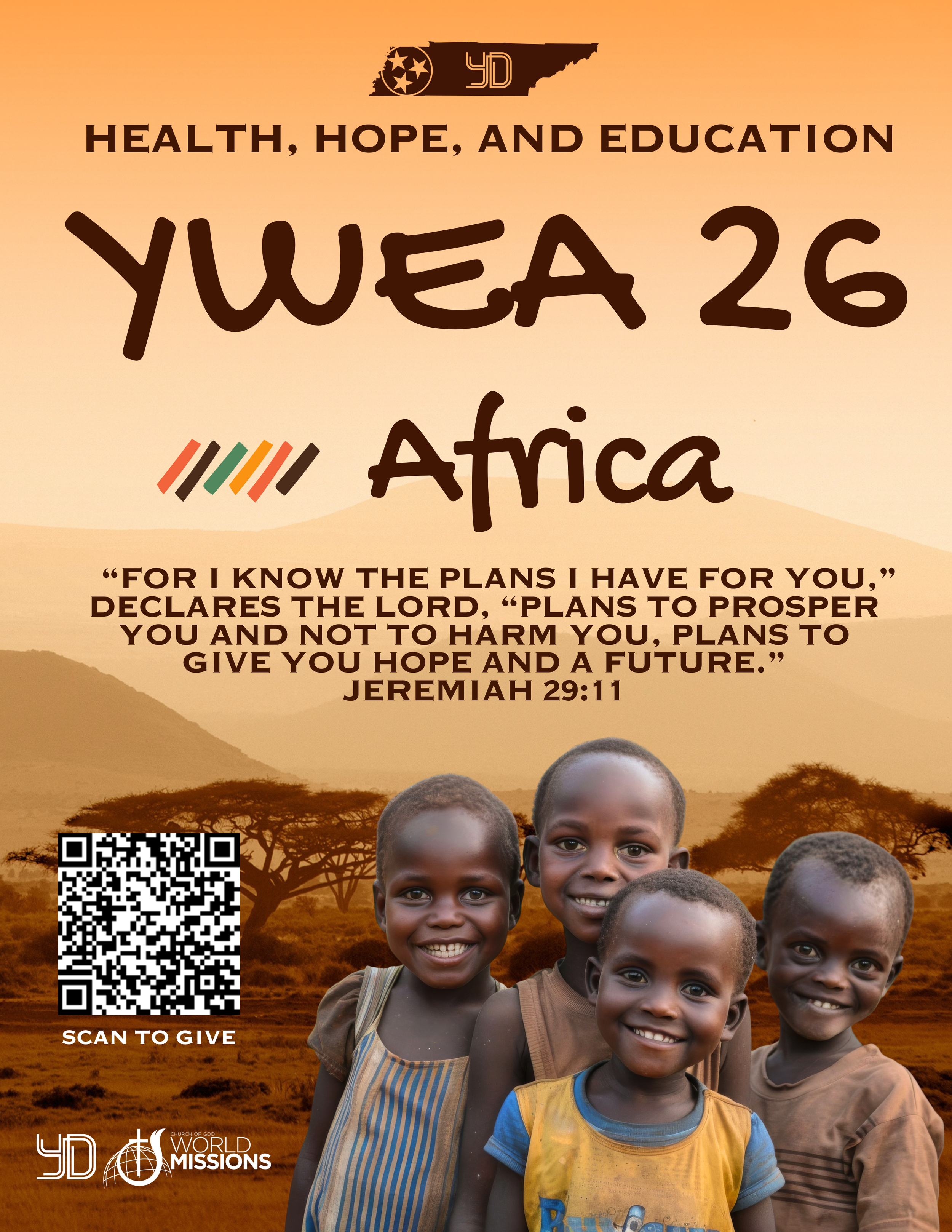 Send your donations to the Tennessee Church of God State Office and mark your donation as the YWEA 2025 project. You and/or your church will receive missions giving credit. All donations are tax deductible and 100% of every dollar goes directly to ministry.
